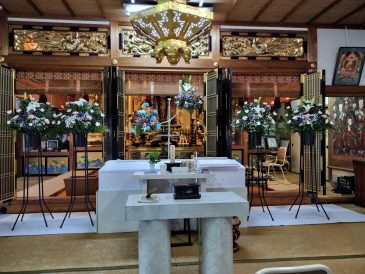 ゆったりとした時間が流れ、阿弥陀様の前に安置された愛しき人を偲ぶ葬儀式。