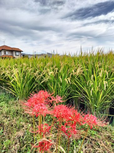 夏の猛暑もようやく過ぎ、黄金色に稲穂が実っている脇に赤い曼殊沙華が咲き、